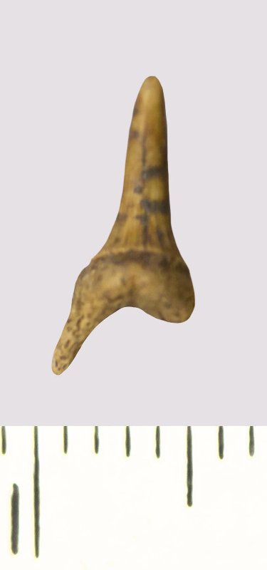 Зуб. Акула. Scapanorhynchus rhaphiodon Agassiz, 1843. Классификация: Хордовые Chordata, Позвоночные Vertebrata, Хрящевые рыбы Chondrichthyes, Пластиножаберные Elasmobranchii