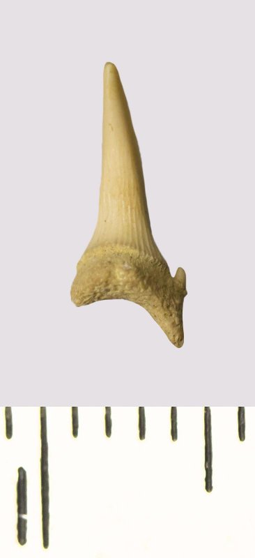 Зуб. Акула. Scapanorhynchus rhaphiodon Agassiz, 1843. Классификация: Хордовые Chordata, Позвоночные Vertebrata, Хрящевые рыбы Chondrichthyes, Пластиножаберные Elasmobranchii