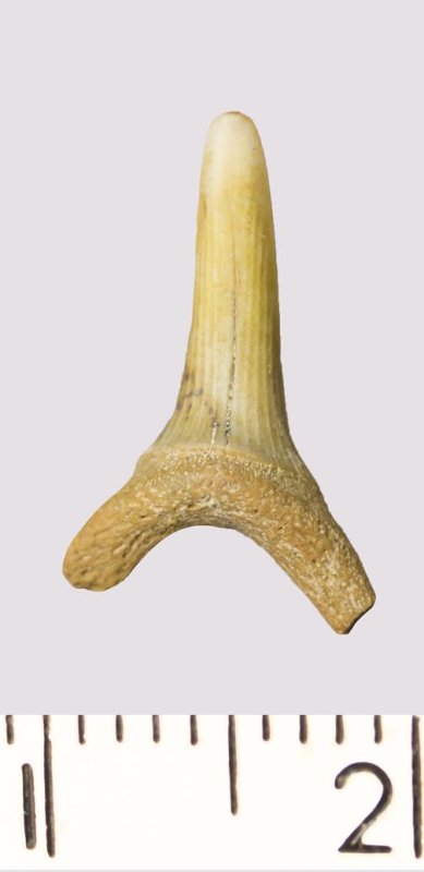 Зуб. Акула. Scapanorhynchus rhaphiodon Agassiz, 1843. Классификация: Хордовые Chordata, Позвоночные Vertebrata, Хрящевые рыбы Chondrichthyes, Пластиножаберные Elasmobranchii