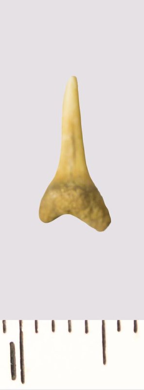 Зуб. Акула. Scapanorhynchus rhaphiodon Agassiz, 1843. Классификация: Хордовые Chordata, Позвоночные Vertebrata, Хрящевые рыбы Chondrichthyes, Пластиножаберные Elasmobranchii