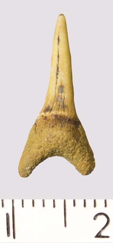 Зуб. Акула. Scapanorhynchus rhaphiodon Agassiz, 1843. Классификация: Хордовые Chordata, Позвоночные Vertebrata, Хрящевые рыбы Chondrichthyes, Пластиножаберные Elasmobranchii