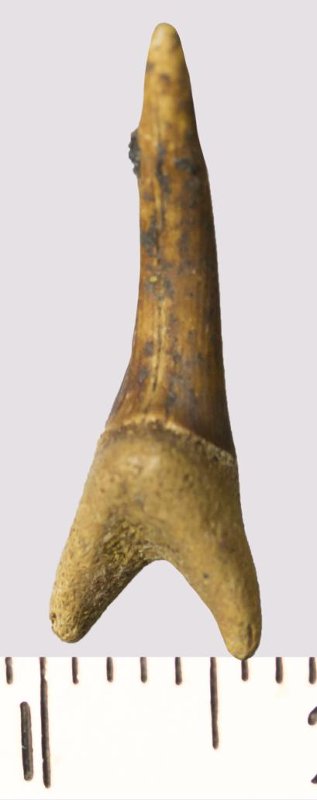 Зуб. Акула. Scapanorhynchus rhaphiodon Agassiz, 1843. Классификация: Хордовые Chordata, Позвоночные Vertebrata, Хрящевые рыбы Chondrichthyes, Пластиножаберные Elasmobranchii