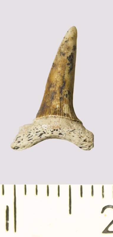 Зуб. Акула. Scapanorhynchus rhaphiodon Agassiz, 1843. Классификация: Хордовые Chordata, Позвоночные Vertebrata, Хрящевые рыбы Chondrichthyes, Пластиножаберные Elasmobranchii