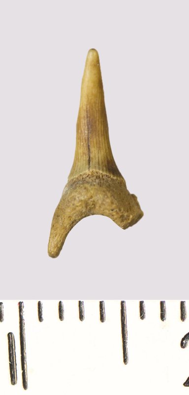 Зуб. Акула. Scapanorhynchus rhaphiodon Agassiz, 1843. Классификация: Хордовые Chordata, Позвоночные Vertebrata, Хрящевые рыбы Chondrichthyes, Пластиножаберные Elasmobranchii