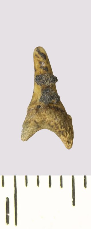 Зуб. Акула. Scapanorhynchus rhaphiodon Agassiz, 1843. Классификация: Хордовые Chordata, Позвоночные Vertebrata, Хрящевые рыбы Chondrichthyes, Пластиножаберные Elasmobranchii