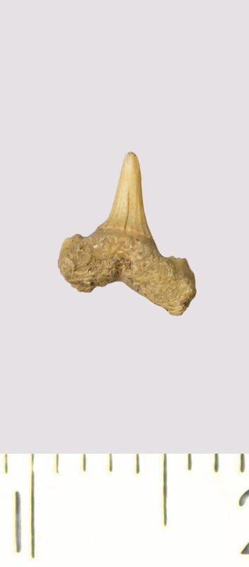 Зуб. Акула. Scapanorhynchus rhaphiodon Agassiz, 1843. Классификация: Хордовые Chordata, Позвоночные Vertebrata, Хрящевые рыбы Chondrichthyes, Пластиножаберные Elasmobranchii