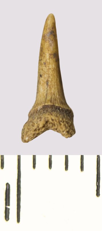 Зуб. Акула. Scapanorhynchus rhaphiodon Agassiz, 1843. Классификация: Хордовые Chordata, Позвоночные Vertebrata, Хрящевые рыбы Chondrichthyes, Пластиножаберные Elasmobranchii