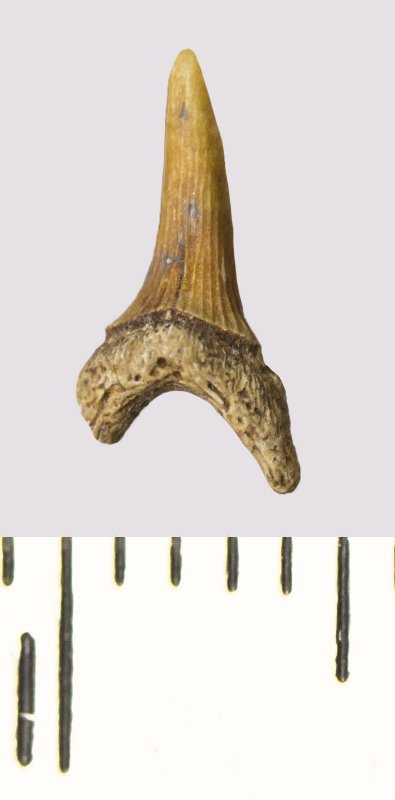 Зуб. Акула. Scapanorhynchus rhaphiodon Agassiz, 1843. Классификация: Хордовые Chordata, Позвоночные Vertebrata, Хрящевые рыбы Chondrichthyes, Пластиножаберные Elasmobranchii