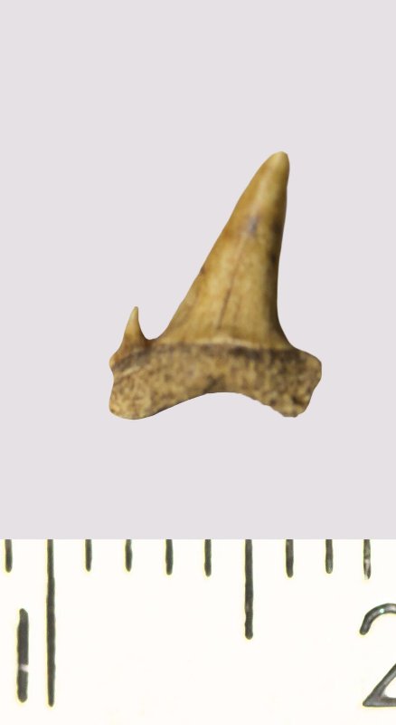 Зуб. Акула. Scapanorhynchus rhaphiodon Agassiz, 1843. Классификация: Хордовые Chordata, Позвоночные Vertebrata, Хрящевые рыбы Chondrichthyes, Пластиножаберные Elasmobranchii