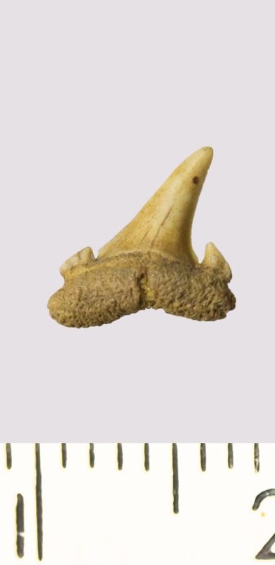 Зуб. Акула. Scapanorhynchus rhaphiodon Agassiz, 1843. Классификация: Хордовые Chordata, Позвоночные Vertebrata, Хрящевые рыбы Chondrichthyes, Пластиножаберные Elasmobranchii