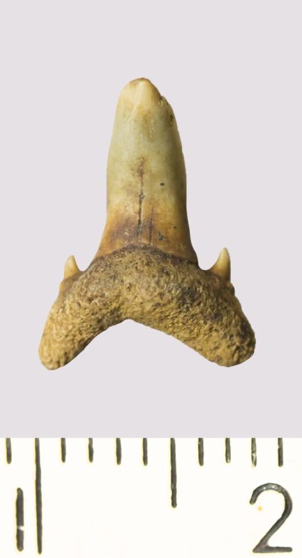 Зуб. Акула. Scapanorhynchus rhaphiodon Agassiz, 1843. Классификация: Хордовые Chordata, Позвоночные Vertebrata, Хрящевые рыбы Chondrichthyes, Пластиножаберные Elasmobranchii