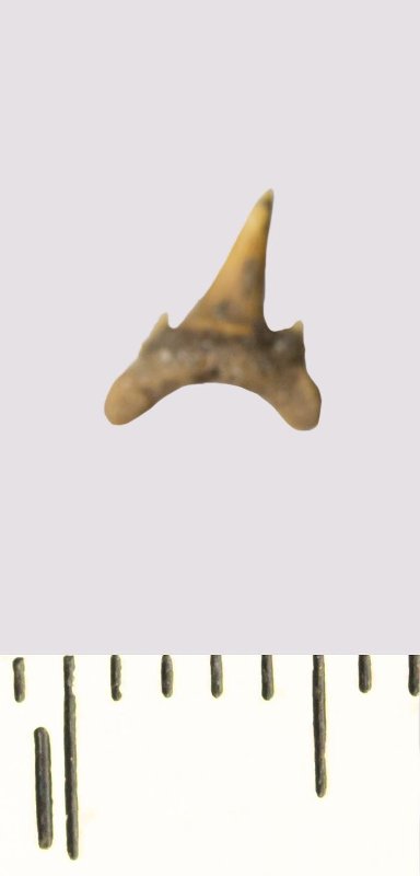 Зуб. Акула. Scapanorhynchus rhaphiodon Agassiz, 1843. Классификация: Хордовые Chordata, Позвоночные Vertebrata, Хрящевые рыбы Chondrichthyes, Пластиножаберные Elasmobranchii