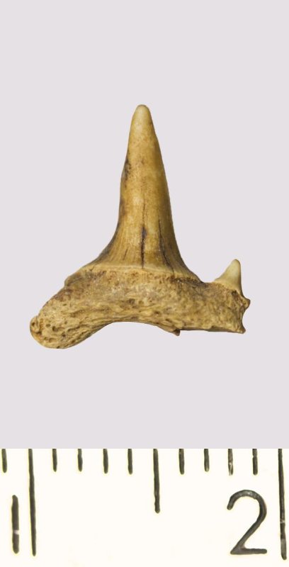 Зуб. Акула. Scapanorhynchus rhaphiodon Agassiz, 1843. Классификация: Хордовые Chordata, Позвоночные Vertebrata, Хрящевые рыбы Chondrichthyes, Пластиножаберные Elasmobranchii