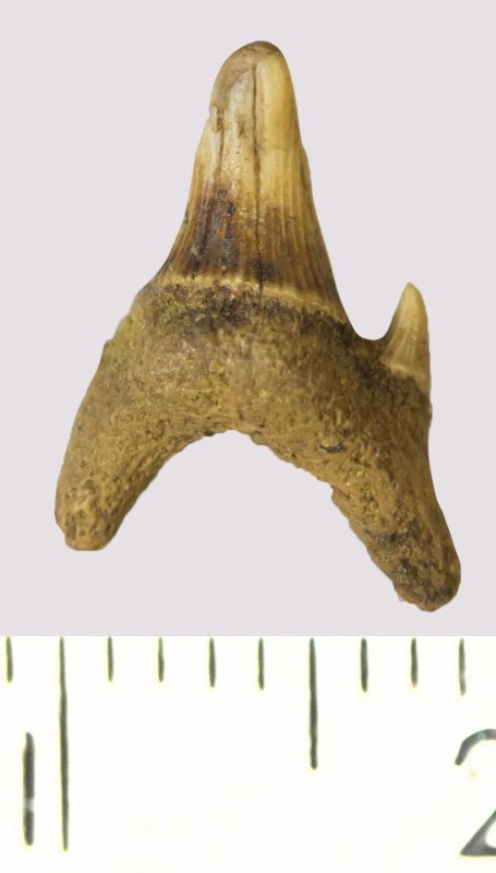 Зуб. Акула. Scapanorhynchus rhaphiodon Agassiz, 1843. Классификация: Хордовые Chordata, Позвоночные Vertebrata, Хрящевые рыбы Chondrichthyes, Пластиножаберные Elasmobranchii