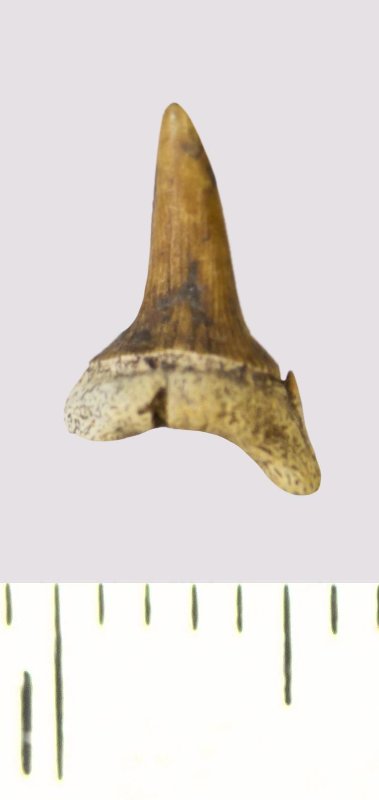 Зуб. Акула. Scapanorhynchus rhaphiodon Agassiz, 1843. Классификация: Хордовые Chordata, Позвоночные Vertebrata, Хрящевые рыбы Chondrichthyes, Пластиножаберные Elasmobranchii