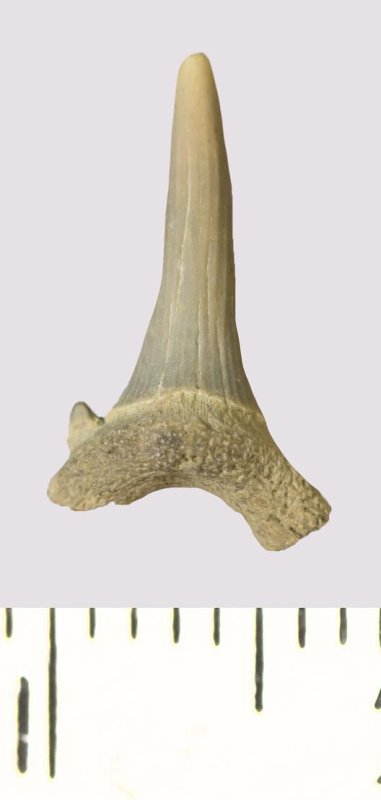 Зуб. Акула. Scapanorhynchus rhaphiodon Agassiz, 1843. Классификация: Хордовые Chordata, Позвоночные Vertebrata, Хрящевые рыбы Chondrichthyes, Пластиножаберные Elasmobranchii