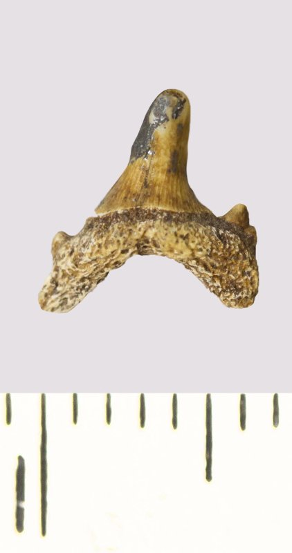 Зуб. Акула. Scapanorhynchus rhaphiodon Agassiz, 1843. Классификация: Хордовые Chordata, Позвоночные Vertebrata, Хрящевые рыбы Chondrichthyes, Пластиножаберные Elasmobranchii