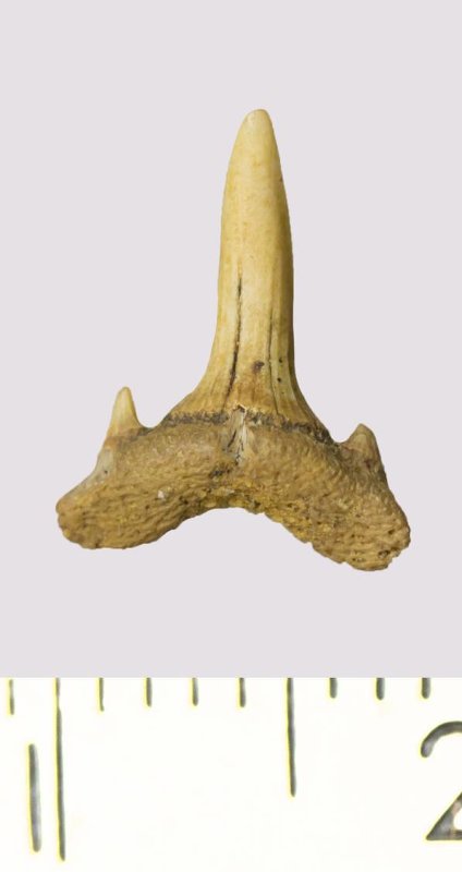 Зуб. Акула. Scapanorhynchus rhaphiodon Agassiz, 1843. Классификация: Хордовые Chordata, Позвоночные Vertebrata, Хрящевые рыбы Chondrichthyes, Пластиножаберные Elasmobranchii