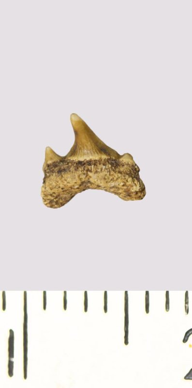 Зуб. Акула. Scapanorhynchus rhaphiodon Agassiz, 1843. Классификация: Хордовые Chordata, Позвоночные Vertebrata, Хрящевые рыбы Chondrichthyes, Пластиножаберные Elasmobranchii