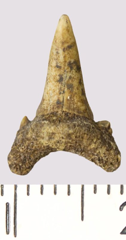 Зуб. Акула. Scapanorhynchus rhaphiodon Agassiz, 1843. Классификация: Хордовые Chordata, Позвоночные Vertebrata, Хрящевые рыбы Chondrichthyes, Пластиножаберные Elasmobranchii
