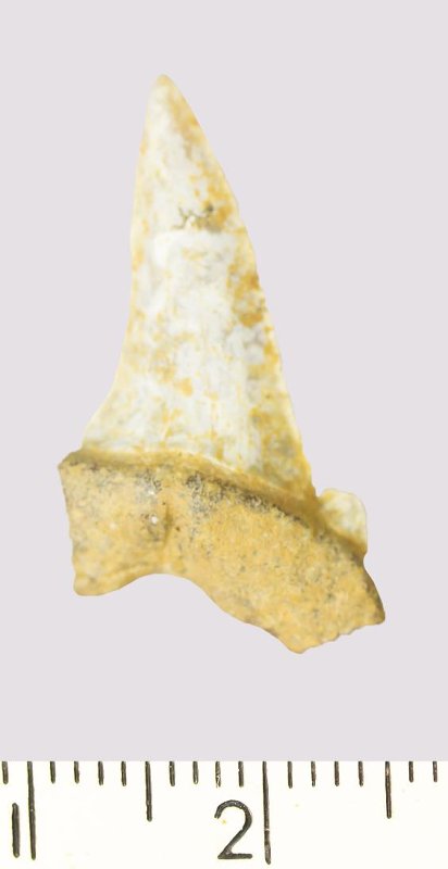 Зуб. Акула. Scapanorhynchus gigas Woodward, 1889. Классификация: Хордовые Chordata, Позвоночные Vertebrata, Хрящевые рыбы Chondrichthyes, Пластиножаберные Elasmobranchii