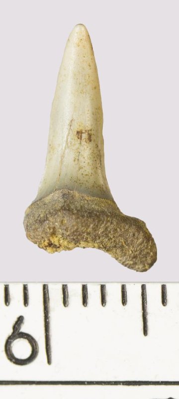 Зуб. Акула. Odontaspis venusta (Leriche, 1929). Классификация: Хордовые Chordata, Позвоночные Vertebrata, Хрящевые рыбы Chondrichthyes, Пластиножаберные Elasmobranchii