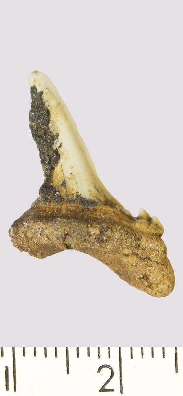 Зуб. Акула. Scapanorhynchus gigas Woodward, 1889. Классификация: Хордовые Chordata, Позвоночные Vertebrata, Хрящевые рыбы Chondrichthyes, Пластиножаберные Elasmobranchii