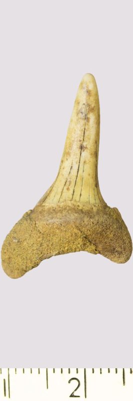 Зуб. Акула. Scapanorhynchus gigas Woodward, 1889. Классификация: Хордовые Chordata, Позвоночные Vertebrata, Хрящевые рыбы Chondrichthyes, Пластиножаберные Elasmobranchii