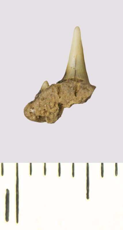 Зуб. Акула. Synechodus sp. Классификация: Хордовые Chordata, Позвоночные Vertebrata, Хрящевые рыбы Chondrichthyes, Пластиножаберные Elasmobranchii
