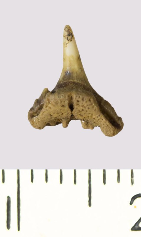 Зуб. Акула. Synechodus sp. Классификация: Хордовые Chordata, Позвоночные Vertebrata, Хрящевые рыбы Chondrichthyes, Пластиножаберные Elasmobranchii