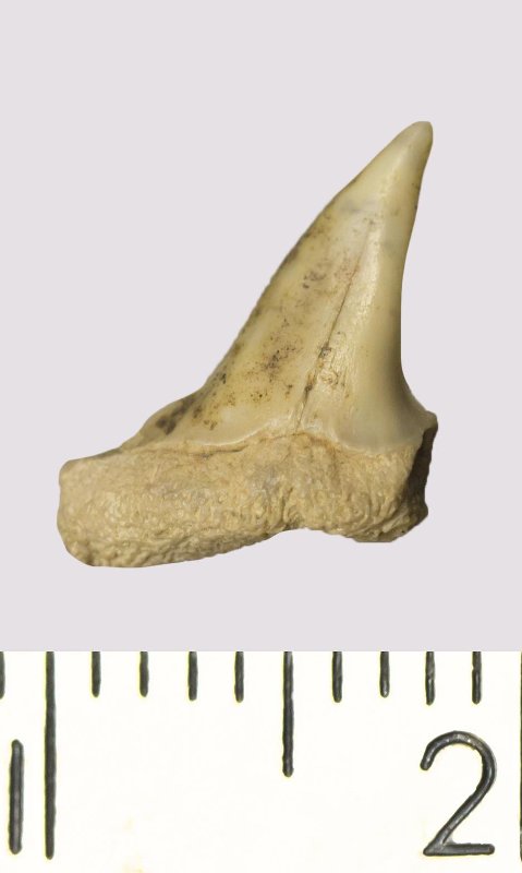 Зуб. Акула. Odontaspis venusta (Leriche, 1929). Классификация: Хордовые Chordata, Позвоночные Vertebrata, Хрящевые рыбы Chondrichthyes, Пластиножаберные Elasmobranchii