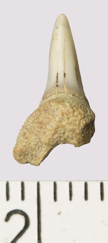 Зуб. Акула. Odontaspis venusta (Leriche, 1929). Классификация: Хордовые Chordata, Позвоночные Vertebrata, Хрящевые рыбы Chondrichthyes, Пластиножаберные Elasmobranchii