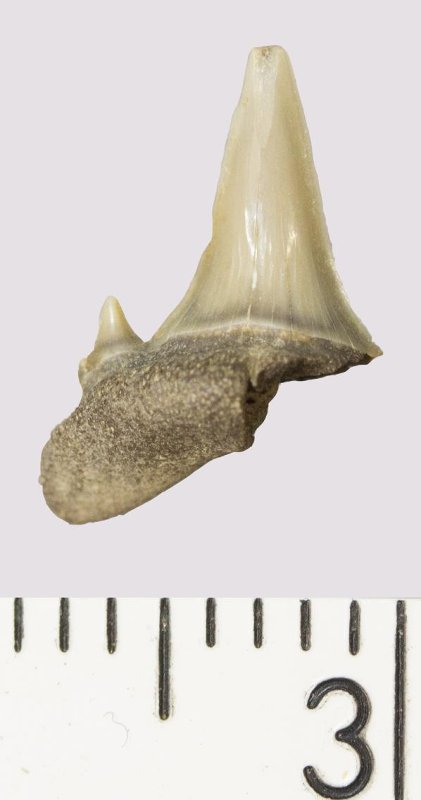 Зуб. Акула. Odontaspis venusta (Leriche, 1929). Классификация: Хордовые Chordata, Позвоночные Vertebrata, Хрящевые рыбы Chondrichthyes, Пластиножаберные Elasmobranchii
