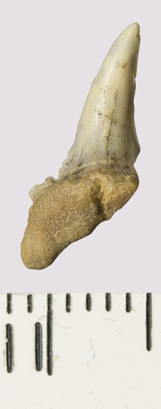 Зуб. Акула. Odontaspis venusta (Leriche, 1929). Классификация: Хордовые Chordata, Позвоночные Vertebrata, Хрящевые рыбы Chondrichthyes, Пластиножаберные Elasmobranchii