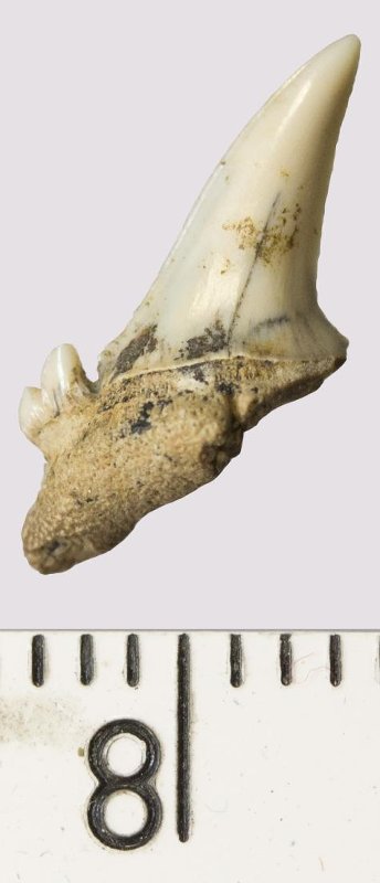Зуб. Акула. Odontaspis venusta (Leriche, 1929). Классификация: Хордовые Chordata, Позвоночные Vertebrata, Хрящевые рыбы Chondrichthyes, Пластиножаберные Elasmobranchii