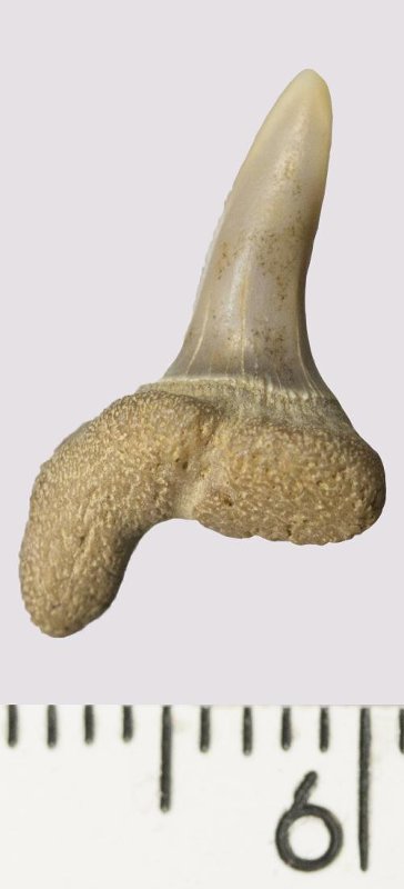 Зуб. Акула. Odontaspis venusta (Leriche, 1929). Классификация: Хордовые Chordata, Позвоночные Vertebrata, Хрящевые рыбы Chondrichthyes, Пластиножаберные Elasmobranchii