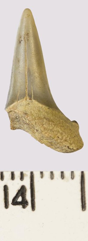 Зуб. Акула. Odontaspis venusta (Leriche, 1929). Классификация: Хордовые Chordata, Позвоночные Vertebrata, Хрящевые рыбы Chondrichthyes, Пластиножаберные Elasmobranchii