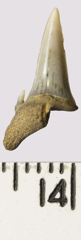 Зуб. Акула. Odontaspis venusta (Leriche, 1929). Классификация: Хордовые Chordata, Позвоночные Vertebrata, Хрящевые рыбы Chondrichthyes, Пластиножаберные Elasmobranchii