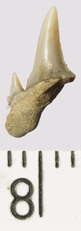 Зуб. Акула. Odontaspis venusta (Leriche, 1929). Классификация: Хордовые Chordata, Позвоночные Vertebrata, Хрящевые рыбы Chondrichthyes, Пластиножаберные Elasmobranchii