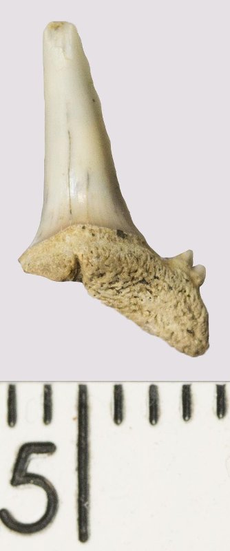 Зуб. Акула. Odontaspis venusta (Leriche, 1929). Классификация: Хордовые Chordata, Позвоночные Vertebrata, Хрящевые рыбы Chondrichthyes, Пластиножаберные Elasmobranchii