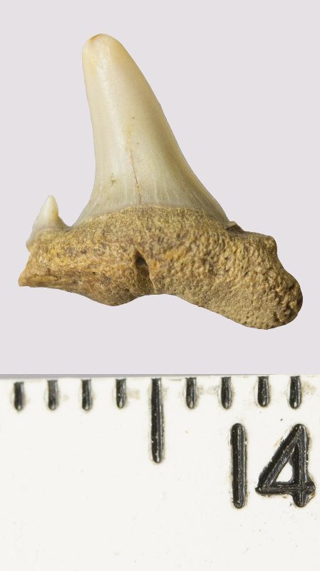 Зуб. Акула. Odontaspis venusta (Leriche, 1929). Классификация: Хордовые Chordata, Позвоночные Vertebrata, Хрящевые рыбы Chondrichthyes, Пластиножаберные Elasmobranchii