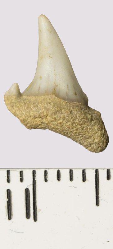 Зуб. Акула. Odontaspis venusta (Leriche, 1929). Классификация: Хордовые Chordata, Позвоночные Vertebrata, Хрящевые рыбы Chondrichthyes, Пластиножаберные Elasmobranchii