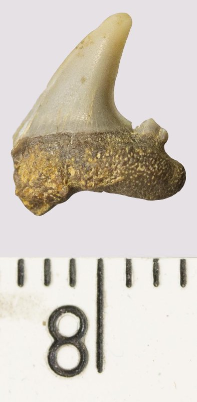 Зуб. Акула. Odontaspis venusta (Leriche, 1929). Классификация: Хордовые Chordata, Позвоночные Vertebrata, Хрящевые рыбы Chondrichthyes, Пластиножаберные Elasmobranchii