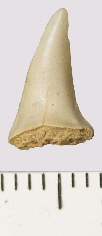 Зуб (фрагмент). Акула. Odontaspis venusta (Leriche, 1929). Классификация: Хордовые Chordata, Позвоночные Vertebrata, Хрящевые рыбы Chondrichthyes, Пластиножаберные Elasmobranchii