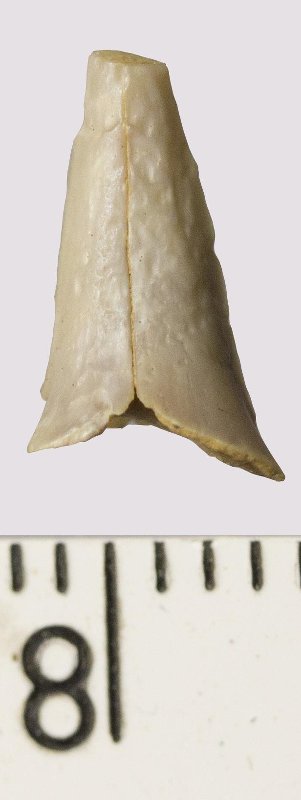 Зуб (фрагмент). Акула. Odontaspis venusta (Leriche, 1929). Классификация: Хордовые Chordata, Позвоночные Vertebrata, Хрящевые рыбы Chondrichthyes, Пластиножаберные Elasmobranchii