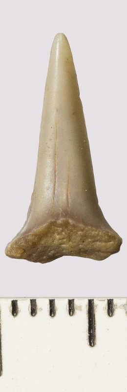 Зуб (фрагмент). Акула. Odontaspis venusta (Leriche, 1929). Классификация: Хордовые Chordata, Позвоночные Vertebrata, Хрящевые рыбы Chondrichthyes, Пластиножаберные Elasmobranchii