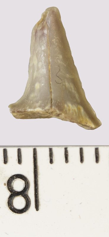 Зуб (фрагмент). Акула. Odontaspis venusta (Leriche, 1929). Классификация: Хордовые Chordata, Позвоночные Vertebrata, Хрящевые рыбы Chondrichthyes, Пластиножаберные Elasmobranchii
