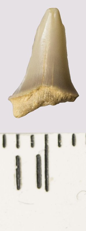 Зуб (фрагмент). Акула. Odontaspis venusta (Leriche, 1929). Классификация: Хордовые Chordata, Позвоночные Vertebrata, Хрящевые рыбы Chondrichthyes, Пластиножаберные Elasmobranchii