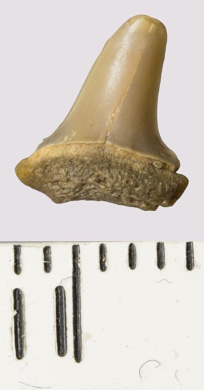 Зуб (фрагмент). Акула. Odontaspis venusta (Leriche, 1929). Классификация: Хордовые Chordata, Позвоночные Vertebrata, Хрящевые рыбы Chondrichthyes, Пластиножаберные Elasmobranchii