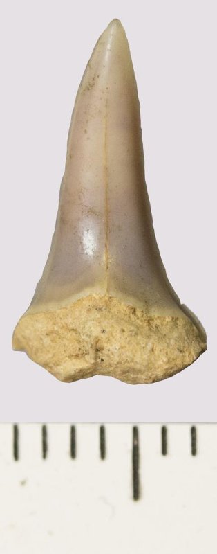 Зуб (фрагмент). Акула. Odontaspis venusta (Leriche, 1929). Классификация: Хордовые Chordata, Позвоночные Vertebrata, Хрящевые рыбы Chondrichthyes, Пластиножаберные Elasmobranchii